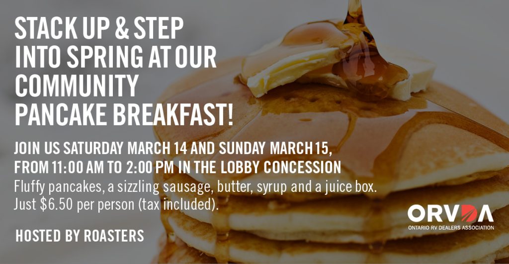 After last year’s flippin’ fantastic turnout, the Community Pancake Breakfast returns to the Kitchener RV Show & Sale and this time you’ve got two chances to dig in! Join us Saturday March 14th and Sunday, March 15th, from 11:00 a.m. to 2:00 p.m. in the lobby concession, hosted by Roasters, for a budget-friendly breakfast that kicks off your show day the right way.